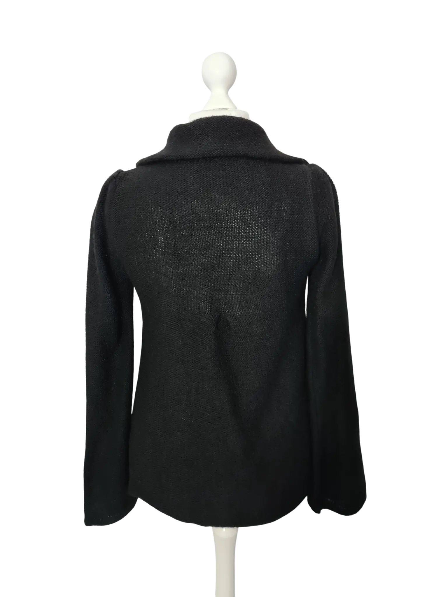 Pull noir fabriqué en Italie. Taille 5 (équivaut à XXL). Détails : double rangée de boutons et col rond légèrement montant.