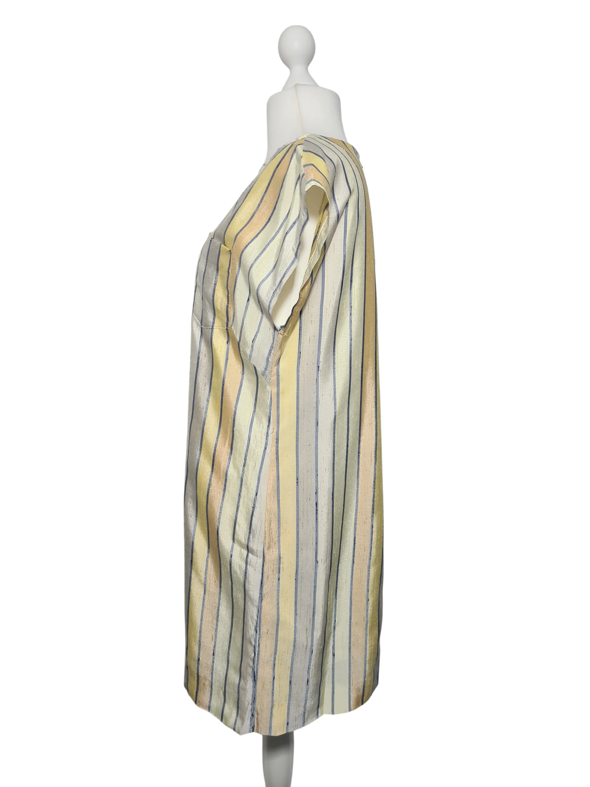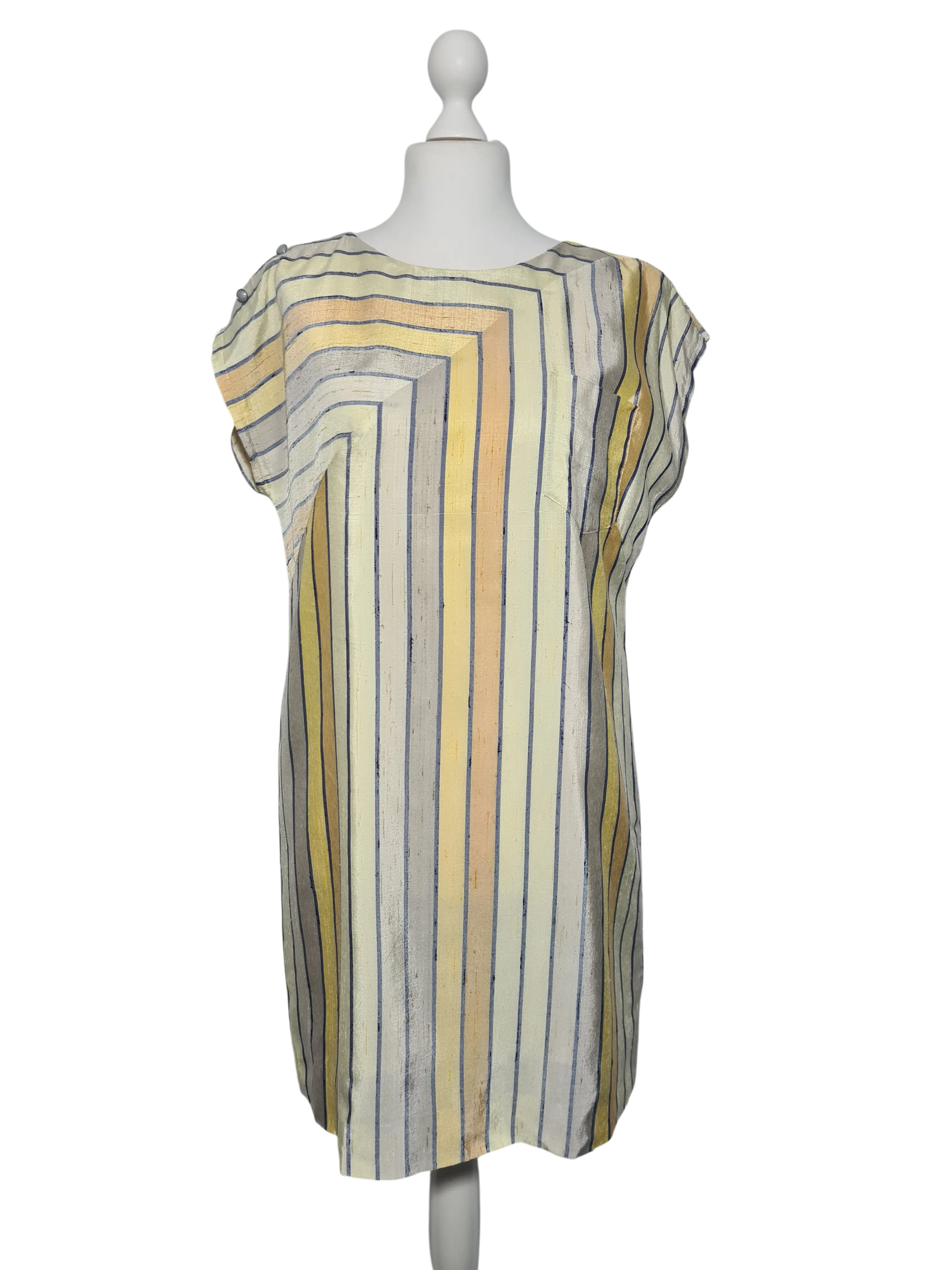 Robe vintage rayée jaune fabriquée en R.F.A. (Allemagne de l’Ouest), typique des années 80. Coupe droite ample avec poche poitrine côté gauche et doublure intérieure. Taille estimée 44/46 (voir mesures).