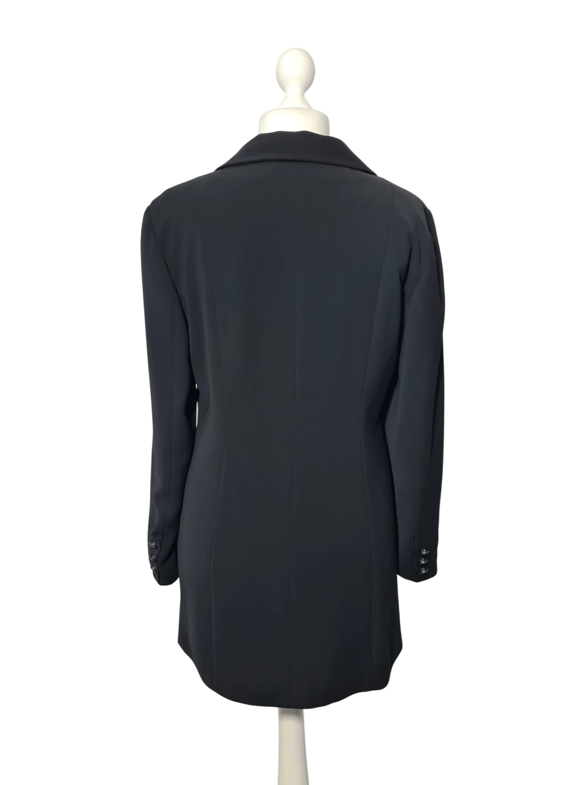 Veste longue noire en crêpe polyester des années 90-2000, fabrication française.